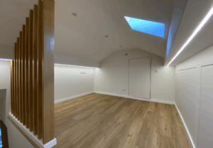 O sótão, que anteriormente era inacessível e inutilizado, foi convertido numa divisão totalmente funcional e acolhedora, com escadas integradas e estruturais, janela de telhado para luz natural e ventilação, e armários embutidos que otimizam o espaço.